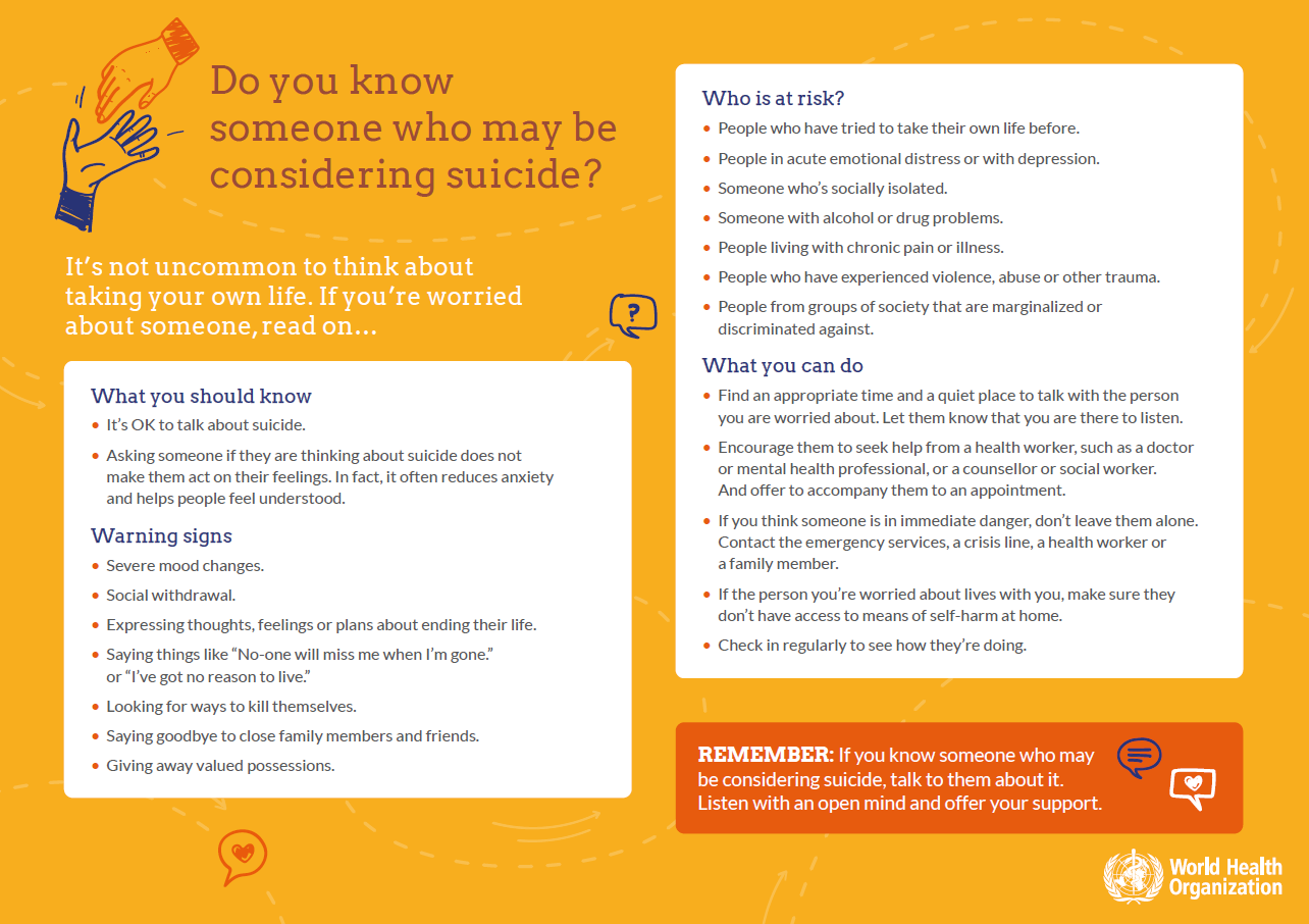 Access to emotional support at the right time and restricting access to highly lethal means of suicide to buy time while dealing with suicidal feelings can prevent suicide. Effective interventions exist. WHO’s LIVE LIFE approach recommends four key interventions which have proven to be effective: